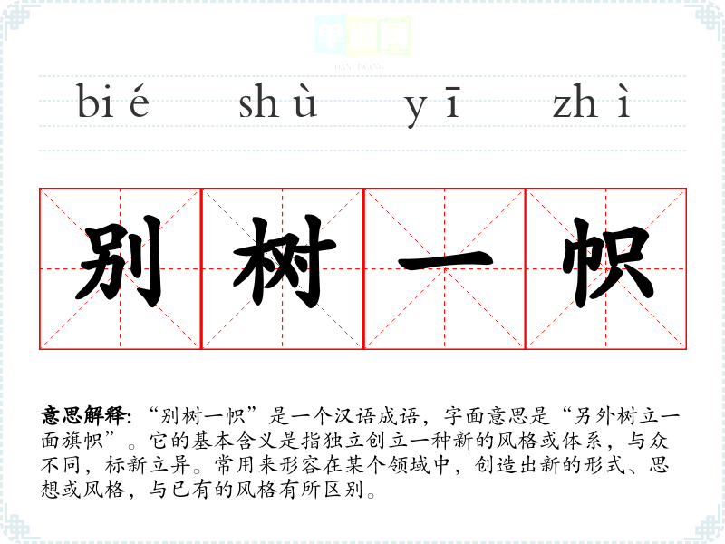 “别树一帜”是一个汉语成语,字面意思是“另外树立一面旗帜”。它的基本含义是指独立创立一种新的风格或体系,与众不同,标新立异。常用来形容在某个领域中,创造出新的形式、思想或风格,与已有的风格有所区别。
