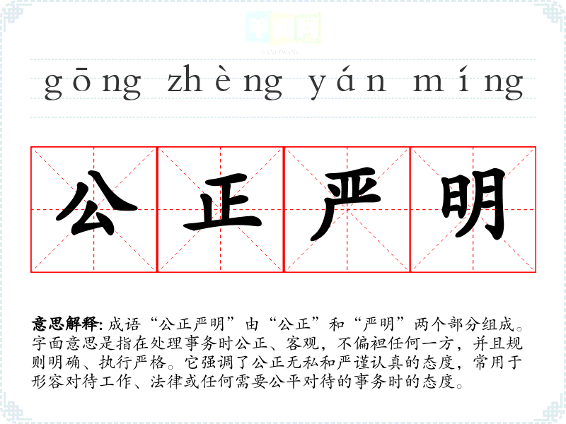 成语“公正严明”由“公正”和“严明”两个部分组成。字面意思是指在处理事务时公正、客观,不偏袒任何一方,并且规则明确、执行严格。它强调了公正无私和严谨认真的态度,常用于形容对待工作、法律或任何需要公平对待的事务时的态度。