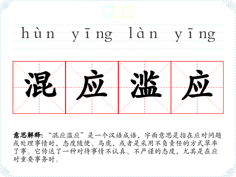 “混应滥应”并没有明确的历史典故或特定的文学出处,但其词根“混”和“滥”常常在古文中用来形容不严谨、不认真。成语的构成反映了对待事务态度的贬义,常用于批评那些对工作不负责任的人或行为。