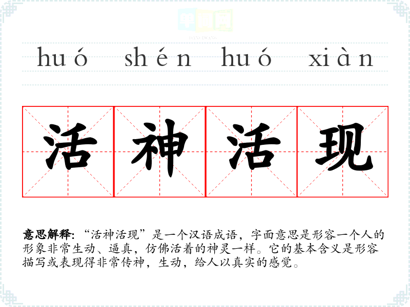 “活神活现”是一个汉语成语,字面意思是形容一个人的形象非常生动、逼真,仿佛活着的神灵一样。它的基本含义是形容描写或表现得非常传神,生动,给人以真实的感觉。
