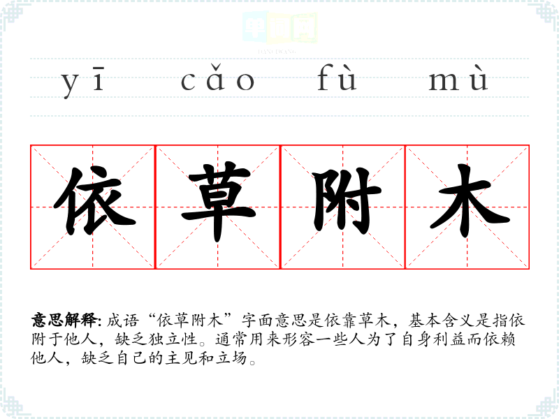 成语“依草附木”字面意思是依靠草木,基本含义是指依附于他人,缺乏独立性。通常用来形容一些人为了自身利益而依赖他人,缺乏自己的主见和立场。