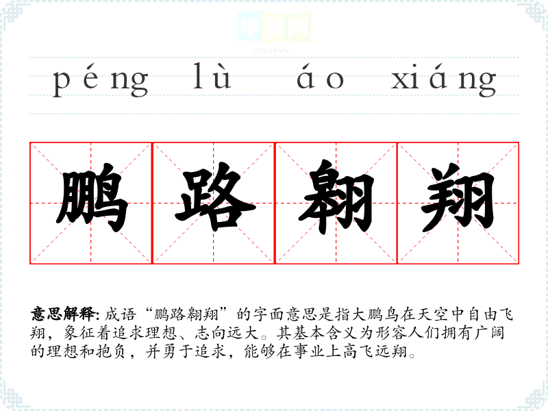 成语“鹏路翱翔”的字面意思是指大鹏鸟在天空中自由飞翔,象征着追求理想、志向远大。其基本含义为形容人们拥有广阔的理想和抱负,并勇于追求,能够在事业上高飞远翔。