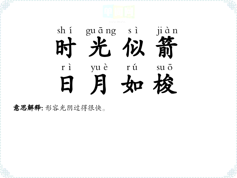 | 光阴荏苒,日月如梭 | 荏苒:不知不觉地过去;梭:织布机上引导纬纱与经纱交织的构件。形容时间过得很快。 |