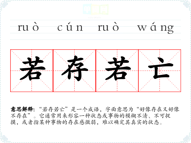 “若存若亡”是一个成语,字面意思为“好像存在又好像不存在”。它通常用来形容一种状态或事物的模糊不清、不可捉摸,或者指某种事物的存在感微弱,难以确定其真实的状态。
