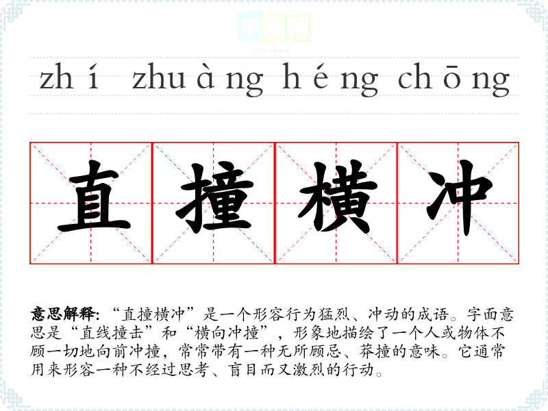 “直撞横冲”是一个形容行为猛烈、冲动的成语。字面意思是“直线撞击”和“横向冲撞”,形象地描绘了一个人或物体不顾一切地向前冲撞,常常带有一种无所顾忌、莽撞的意味。它通常用来形容一种不经过思考、盲目而又激烈的行动。