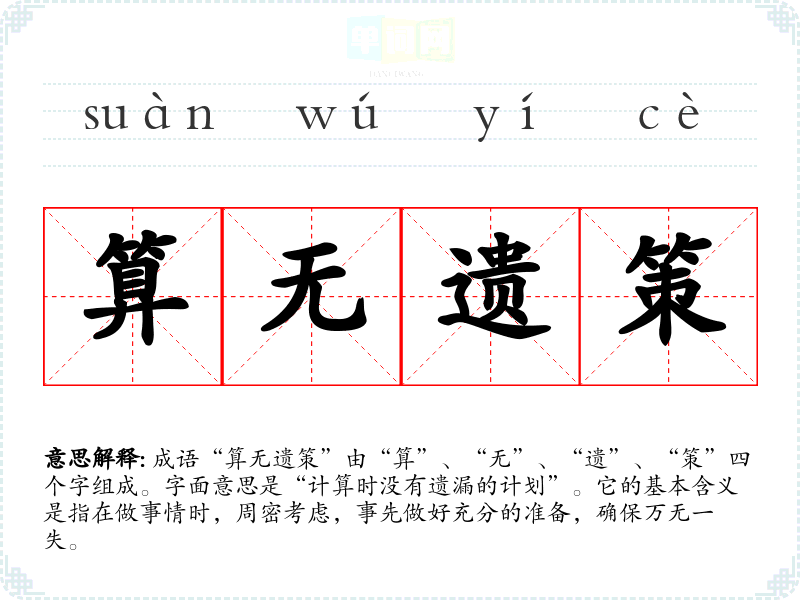 成语“算无遗策”由“算”、“无”、“遗”、“策”四个字组成。字面意思是“计算时没有遗漏的计划”。它的基本含义是指在做事情时,周密考虑,事先做好充分的准备,确保万无一失。