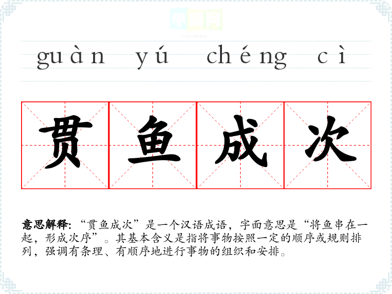 “贯鱼成次”是一个汉语成语,字面意思是“将鱼串在一起,形成次序”。其基本含义是指将事物按照一定的顺序或规则排列,强调有条理、有顺序地进行事物的组织和安排。