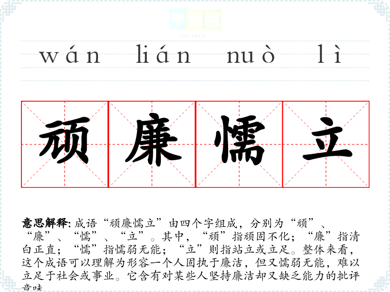 成语“顽廉懦立”由四个字组成,分别为“顽”、“廉”、“懦”、“立”。其中,“顽”指顽固不化;“廉”指清白正直;“懦”指懦弱无能;“立”则指站立或立足。整体来看,这个成语可以理解为形容一个人固执于廉洁,但又懦弱无能,难以立足于社会或事业。它含有对某些人坚持廉洁却又缺乏能力的批评意味。