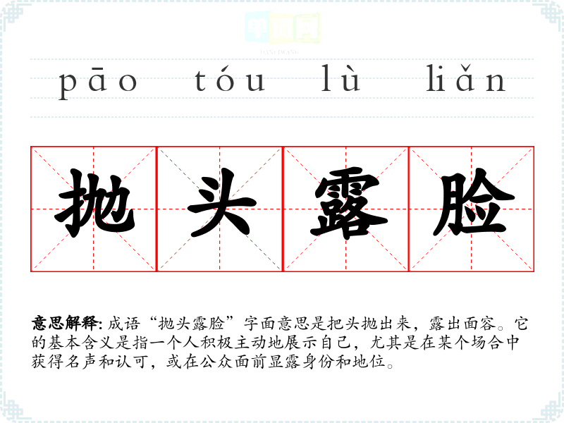 成语“抛头露脸”字面意思是把头抛出来,露出面容。它的基本含义是指一个人积极主动地展示自己,尤其是在某个场合中获得名声和认可,或在公众面前显露身份和地位。