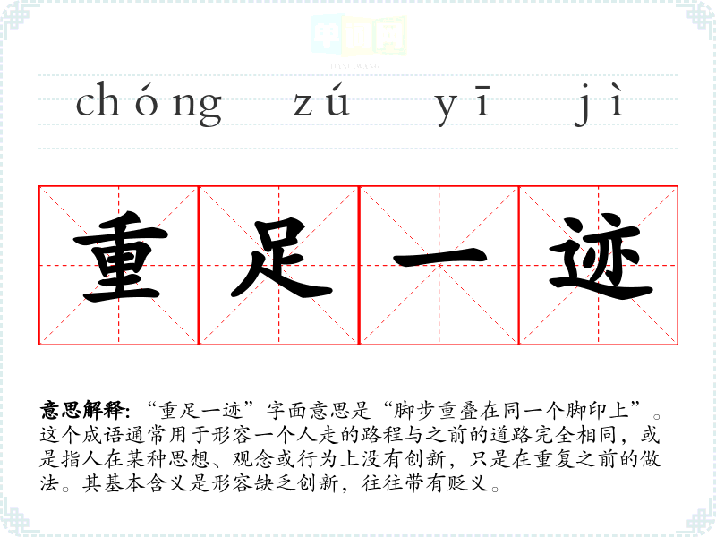 “重足一迹”字面意思是“脚步重叠在同一个脚印上”。这个成语通常用于形容一个人走的路程与之前的道路完全相同,或是指人在某种思想、观念或行为上没有创新,只是在重复之前的做法。其基本含义是形容缺乏创新,往往带有贬义。