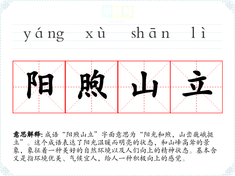 成语“阳煦山立”字面意思为“阳光和煦,山峦巍峨挺立”。这个成语表达了阳光温暖而明亮的状态,和山峰高耸的景象,象征着一种美好的自然环境以及人们向上的精神状态。基本含义是指环境优美、气候宜人,给人一种积极向上的感觉。
