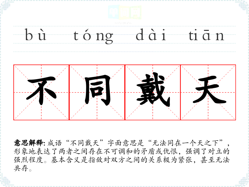成语“不同戴天”字面意思是“无法同在一个天之下”,形象地表达了两者之间存在不可调和的矛盾或仇恨,强调了对立的强烈程度。基本含义是指敌对双方之间的关系极为紧张,甚至无法共存。