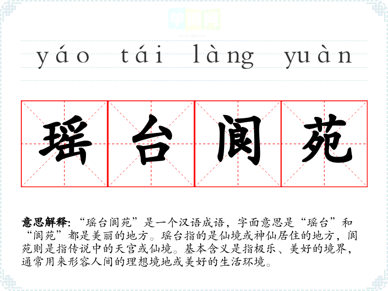 | 阆苑瑶台 | 阆:空旷;瑶:美玉;瑶台:雕饰华丽、结构精巧的楼台。广大的园林,华美的楼台。 |