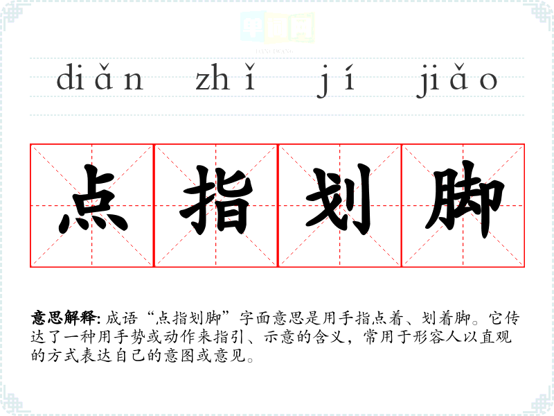 成语“点指划脚”字面意思是用手指点着、划着脚。它传达了一种用手势或动作来指引、示意的含义,常用于形容人以直观的方式表达自己的意图或意见。