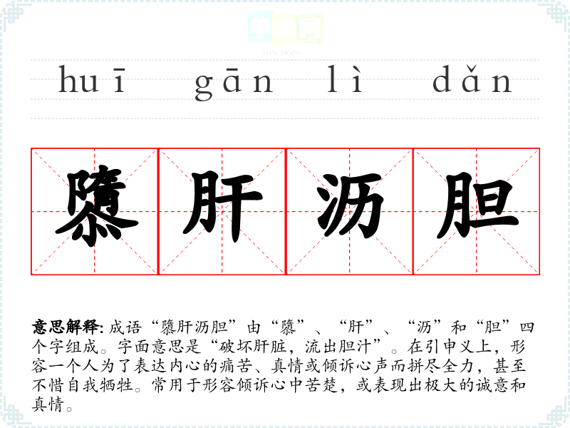 成语“隳肝沥胆”由“隳”、“肝”、“沥”和“胆”四个字组成。字面意思是“破坏肝脏,流出胆汁”。在引申义上,形容一个人为了表达内心的痛苦、真情或倾诉心声而拼尽全力,甚至不惜自我牺牲。常用于形容倾诉心中苦楚,或表现出极大的诚意和真情。