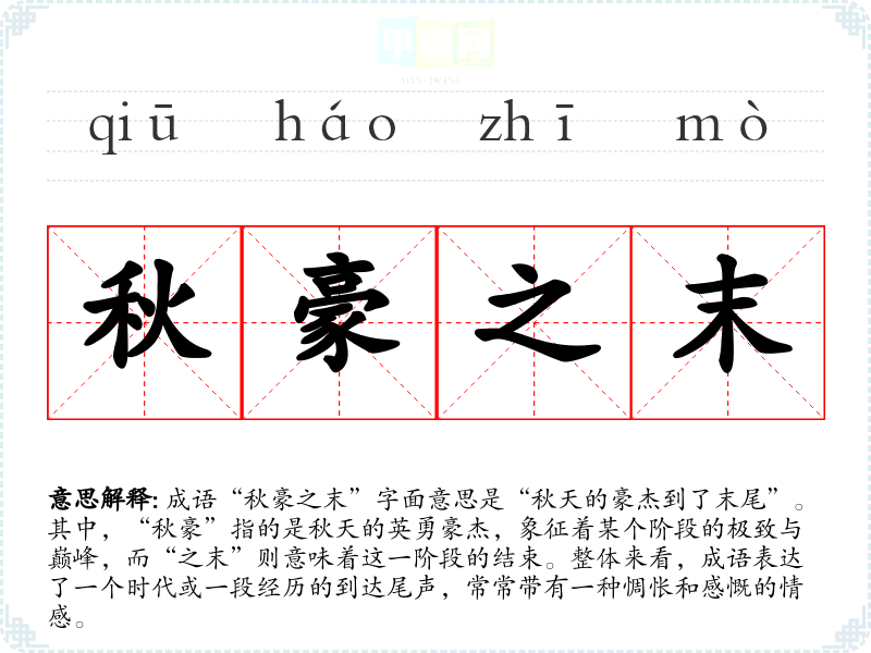 “秋豪之末”的具体来源并不明确,但可以从字面解析出其意。在古代,秋天往往被视为丰收的季节,而“豪杰”则象征着那些杰出的人物。此成语可能源于对某个辉煌时刻的追忆与总结,反映了人们对辉煌过往的缅怀与对未来的期待。