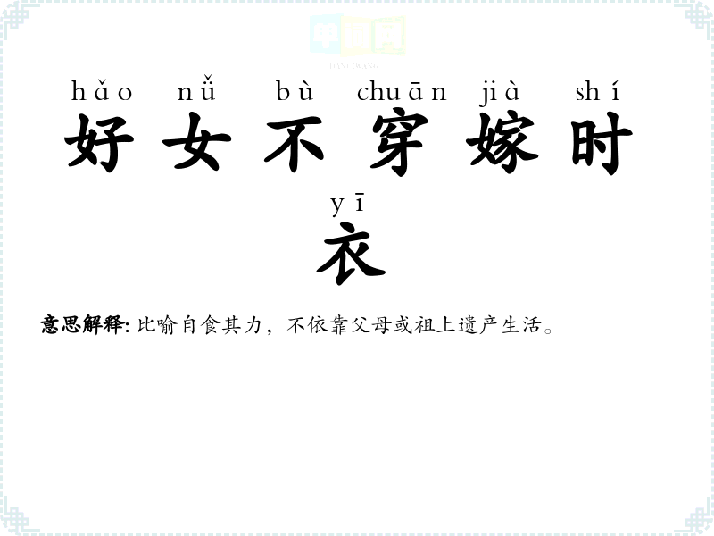 | 好女不穿嫁时衣 | 比喻自食其力,不依靠父母或祖上遗产生活。 |