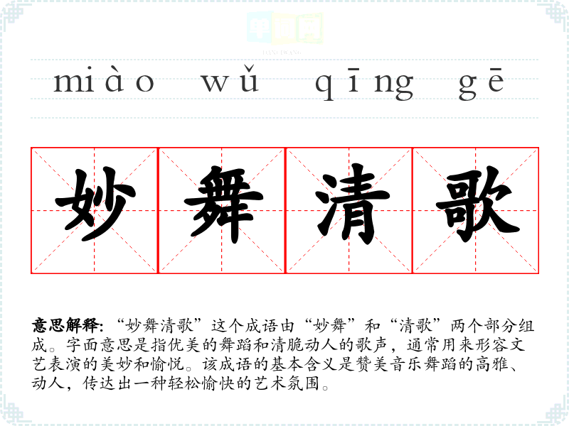 “妙舞清歌”这个成语由“妙舞”和“清歌”两个部分组成。字面意思是指优美的舞蹈和清脆动人的歌声,通常用来形容文艺表演的美妙和愉悦。该成语的基本含义是赞美音乐舞蹈的高雅、动人,传达出一种轻松愉快的艺术氛围。