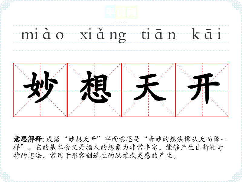 成语“妙想天开”字面意思是“奇妙的想法像从天而降一样”。它的基本含义是指人的想象力非常丰富,能够产生出新颖奇特的想法,常用于形容创造性的思维或灵感的产生。