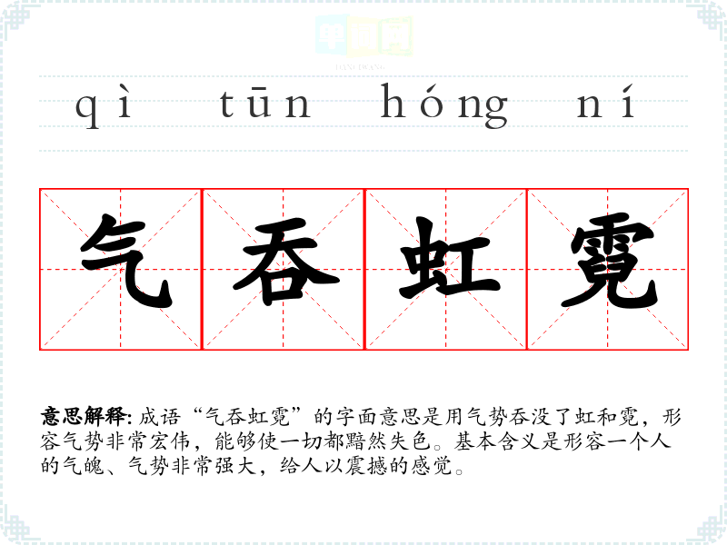 成语“气吞虹霓”的字面意思是用气势吞没了虹和霓,形容气势非常宏伟,能够使一切都黯然失色。基本含义是形容一个人的气魄、气势非常强大,给人以震撼的感觉。