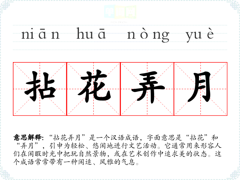 “拈花弄月”是一个汉语成语,字面意思是“拈花”和“弄月”,引申为轻松、悠闲地进行文艺活动。它通常用来形容人们在闲暇时光中把玩自然景物,或在艺术创作中追求美的状态。这个成语常常带有一种闲适、风雅的气息。