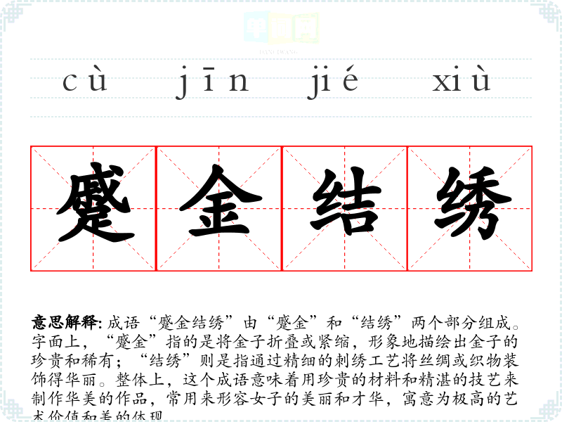 成语“蹙金结绣”由“蹙金”和“结绣”两个部分组成。字面上,“蹙金”指的是将金子折叠或紧缩,形象地描绘出金子的珍贵和稀有;“结绣”则是指通过精细的刺绣工艺将丝绸或织物装饰得华丽。整体上,这个成语意味着用珍贵的材料和精湛的技艺来制作华美的作品,常用来形容女子的美丽和才华,寓意为极高的艺术价值和美的体现。