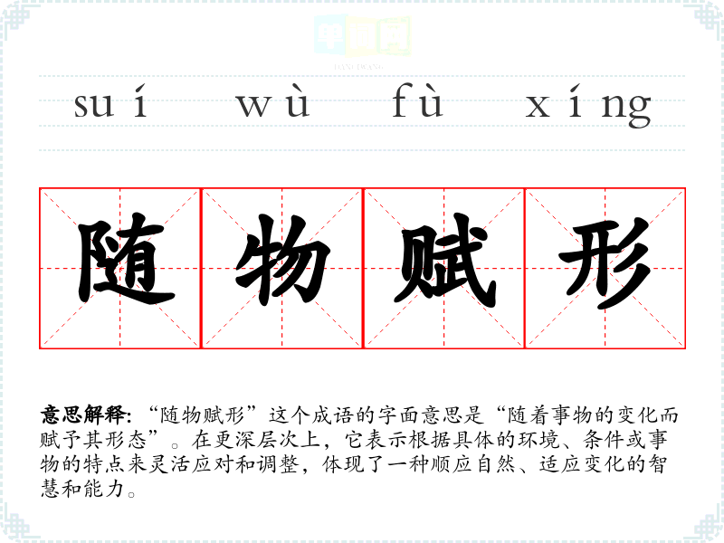 “随物赋形”这个成语的字面意思是“随着事物的变化而赋予其形态”。在更深层次上,它表示根据具体的环境、条件或事物的特点来灵活应对和调整,体现了一种顺应自然、适应变化的智慧和能力。