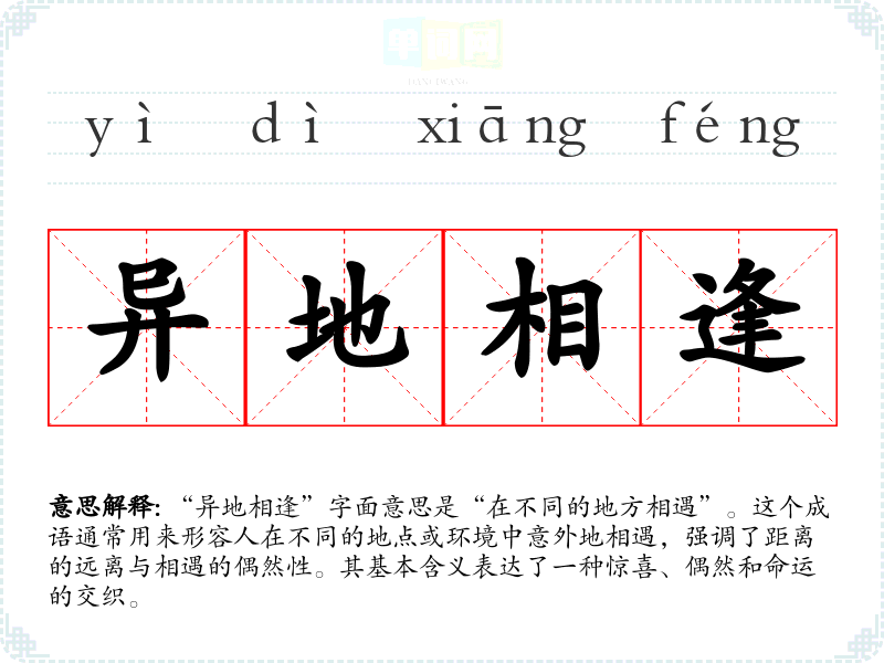 “异地相逢”字面意思是“在不同的地方相遇”。这个成语通常用来形容人在不同的地点或环境中意外地相遇,强调了距离的远离与相遇的偶然性。其基本含义表达了一种惊喜、偶然和命运的交织。