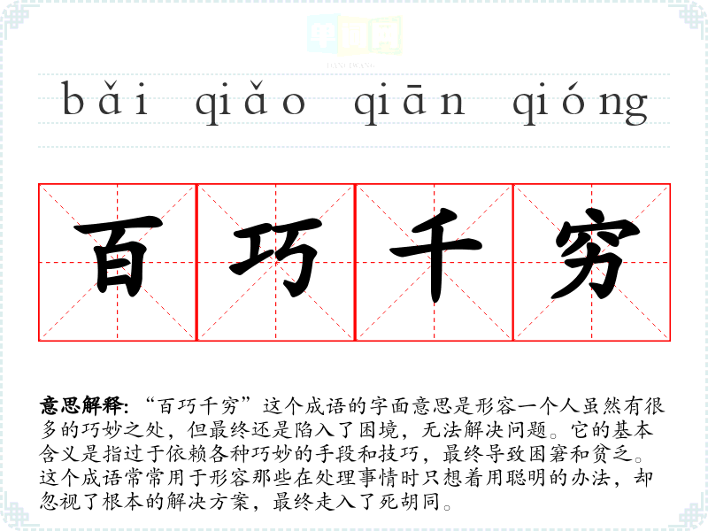 “百巧千穷”这个成语的字面意思是形容一个人虽然有很多的巧妙之处,但最终还是陷入了困境,无法解决问题。它的基本含义是指过于依赖各种巧妙的手段和技巧,最终导致困窘和贫乏。这个成语常常用于形容那些在处理事情时只想着用聪明的办法,却忽视了根本的解决方案,最终走入了死胡同。