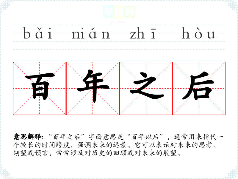 “百年之后”字面意思是“百年以后”,通常用来指代一个较长的时间跨度,强调未来的远景。它可以表示对未来的思考、期望或预言,常常涉及对历史的回顾或对未来的展望。