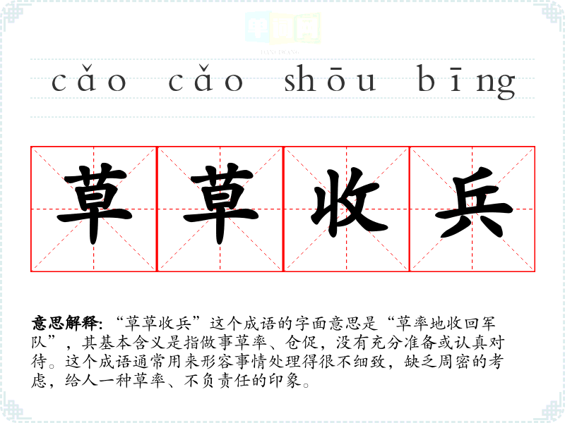 “草草收兵”这个成语的字面意思是“草率地收回军队”,其基本含义是指做事草率、仓促,没有充分准备或认真对待。这个成语通常用来形容事情处理得很不细致,缺乏周密的考虑,给人一种草率、不负责任的印象。