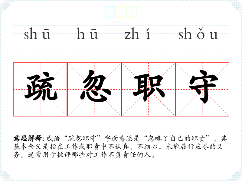成语“疏忽职守”字面意思是“忽略了自己的职责”。其基本含义是指在工作或职责中不认真、不细心,未能履行应尽的义务。通常用于批评那些对工作不负责任的人。