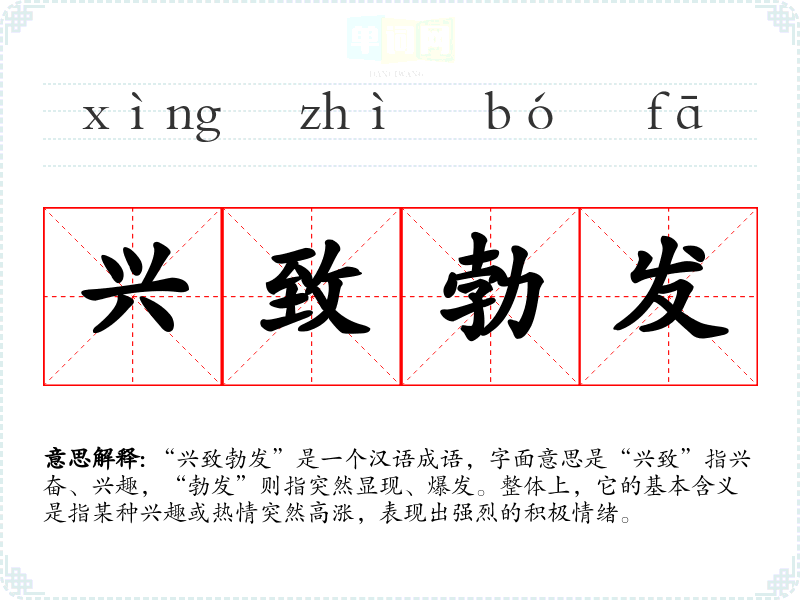 “兴致勃发”是一个汉语成语,字面意思是“兴致”指兴奋、兴趣,“勃发”则指突然显现、爆发。整体上,它的基本含义是指某种兴趣或热情突然高涨,表现出强烈的积极情绪。