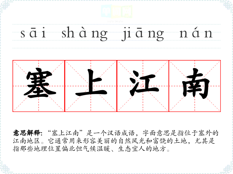 “塞上江南”是一个汉语成语,字面意思是指位于塞外的江南地区。它通常用来形容美丽的自然风光和富饶的土地,尤其是指那些地理位置偏北但气候温暖、生态宜人的地方。