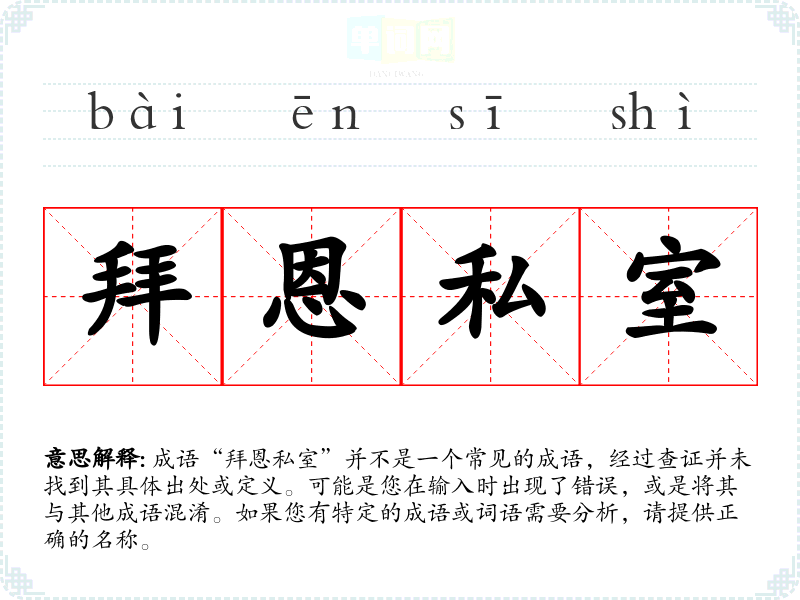 成语“拜恩私室”并不是一个常见的成语,经过查证并未找到其具体出处或定义。可能是您在输入时出现了错误,或是将其与其他成语混淆。如果您有特定的成语或词语需要分析,请提供正确的名称。