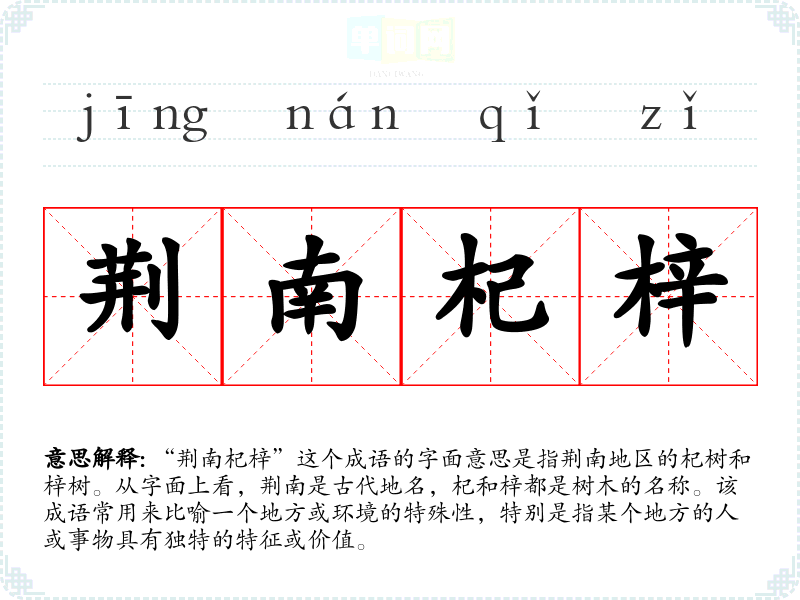 “荆南杞梓”出自《左传》,提到的是荆南地区的树木,象征着地方的特色和特有的文化背景。成语的使用反映了古代人对自然和环境的重视,说明了特定地域的独特性。