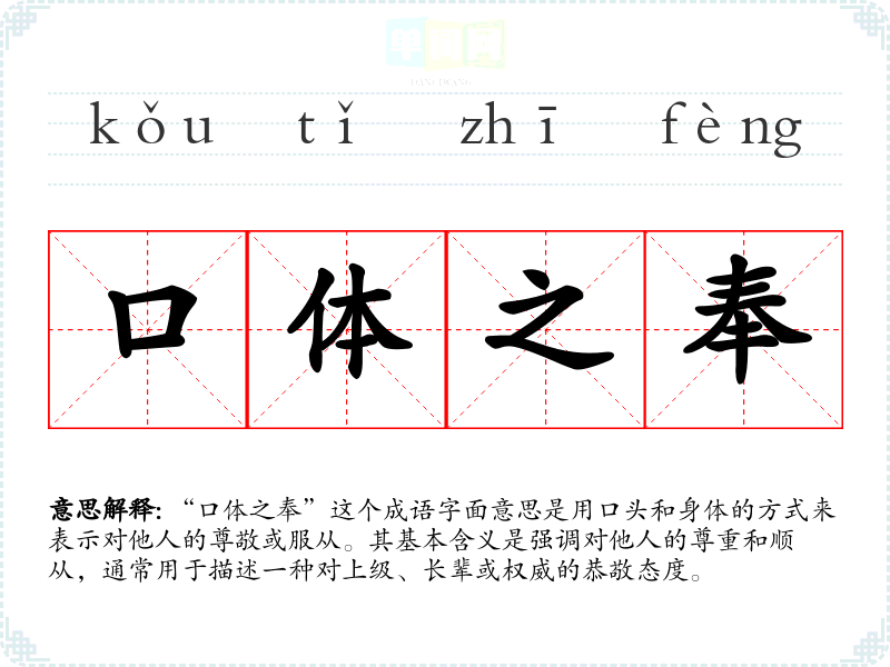 “口体之奉”这个成语字面意思是用口头和身体的方式来表示对他人的尊敬或服从。其基本含义是强调对他人的尊重和顺从,通常用于描述一种对上级、长辈或权威的恭敬态度。
