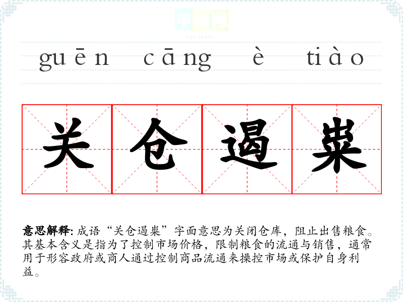 成语“关仓遏粜”字面意思为关闭仓库,阻止出售粮食。其基本含义是指为了控制市场价格,限制粮食的流通与销售,通常用于形容政府或商人通过控制商品流通来操控市场或保护自身利益。
