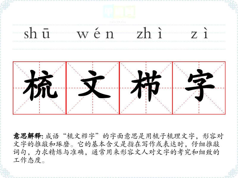 成语“梳文栉字”的字面意思是用梳子梳理文字,形容对文字的推敲和琢磨。它的基本含义是指在写作或表达时,仔细推敲词句,力求精炼与准确,通常用来形容文人对文字的考究和细致的工作态度。