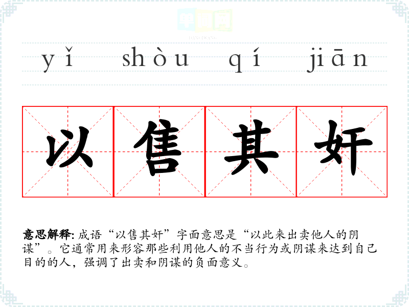 成语“以售其奸”字面意思是“以此来出卖他人的阴谋”。它通常用来形容那些利用他人的不当行为或阴谋来达到自己目的的人,强调了出卖和阴谋的负面意义。