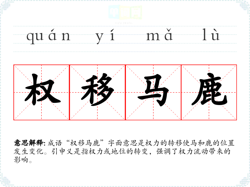成语“权移马鹿”字面意思是权力的转移使马和鹿的位置发生变化。引申义是指权力或地位的转变,强调了权力流动带来的影响。