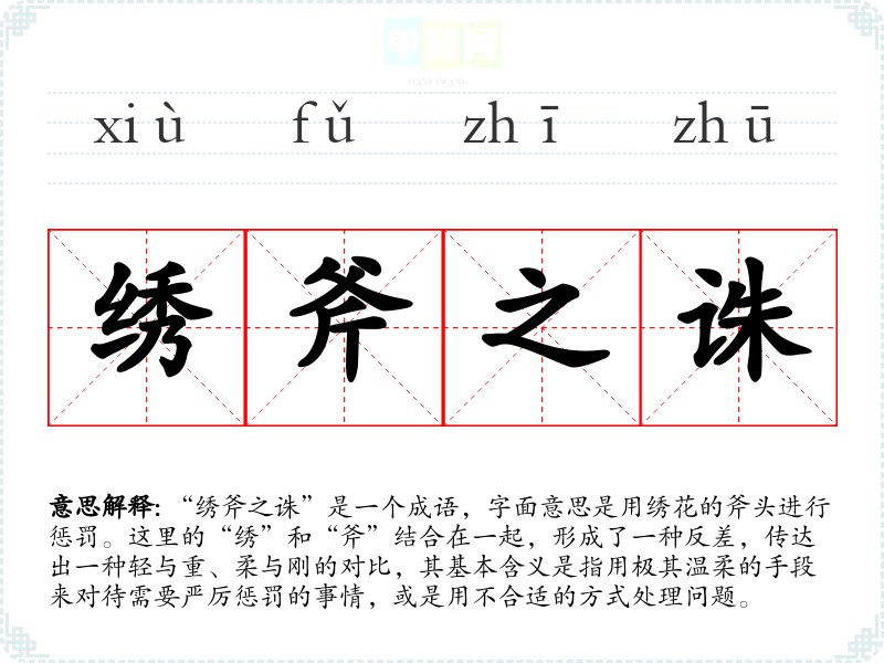“绣斧之诛”是一个成语,字面意思是用绣花的斧头进行惩罚。这里的“绣”和“斧”结合在一起,形成了一种反差,传达出一种轻与重、柔与刚的对比,其基本含义是指用极其温柔的手段来对待需要严厉惩罚的事情,或是用不合适的方式处理问题。