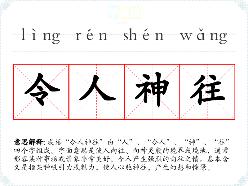 | 令人神往 | 令:使,让;神往:心神向往。使人非常向往。 |