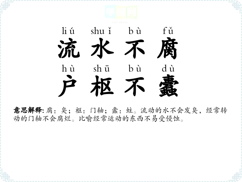 | 流水不腐,户枢不蠹 | 腐:臭;枢:门轴;蠹:蛀。流动的水不会发臭,经常转动的门轴不会腐烂。比喻经常运动的东西不易受侵蚀。 |