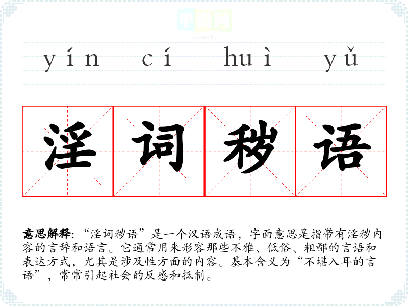“淫词秽语”是一个汉语成语,字面意思是指带有淫秽内容的言辞和语言。它通常用来形容那些不雅、低俗、粗鄙的言语和表达方式,尤其是涉及性方面的内容。基本含义为“不堪入耳的言语”,常常引起社会的反感和抵制。