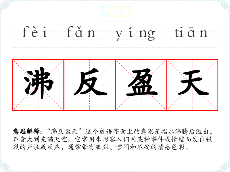 “沸反盈天”这个成语字面上的意思是指水沸腾后溢出,声音大到充满天空。它常用来形容人们因某种**或情绪而发出强烈的声浪或反应,通常带有激烈、喧闹和不安的情感色彩。