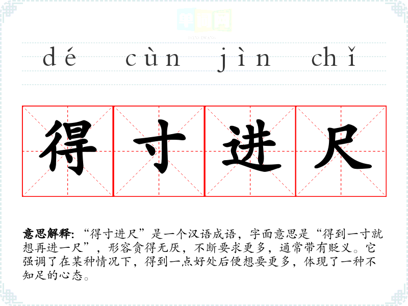 “得寸进尺”是一个汉语成语,字面意思是“得到一寸就想再进一尺”,形容贪得无厌,不断要求更多,通常带有贬义。它强调了在某种情况下,得到一点好处后便想要更多,体现了一种不知足的心态。