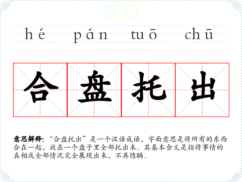 “合盘托出”是一个汉语成语,字面意思是将所有的东西合在一起,放在一个盘子里全部托出来。其基本含义是指将事情的真相或全部情况完全展现出来,不再隐瞒。