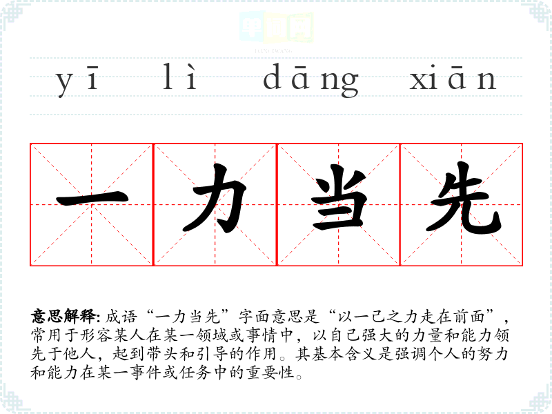 通过对“一力当先”的学,我认识到个人的努力和能力在团队和社会中是多么的重要。它不仅仅是一种表达,更是一种激励,让我们在生活和工作中不断追求卓越。这个成语在我的语言学和表达中,增强了我的信心,激励我在面对挑战时勇往直前。
