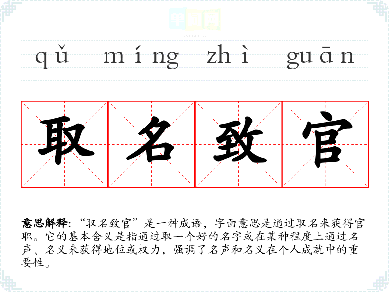 “取名致官”是一种成语,字面意思是通过取名来获得官职。它的基本含义是指通过取一个好的名字或在某种程度上通过名声、名义来获得地位或权力,强调了名声和名义在个人成就中的重要性。